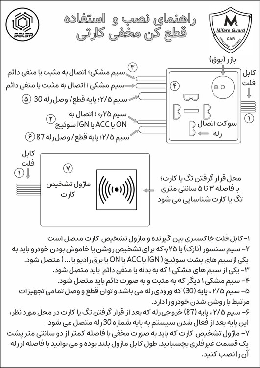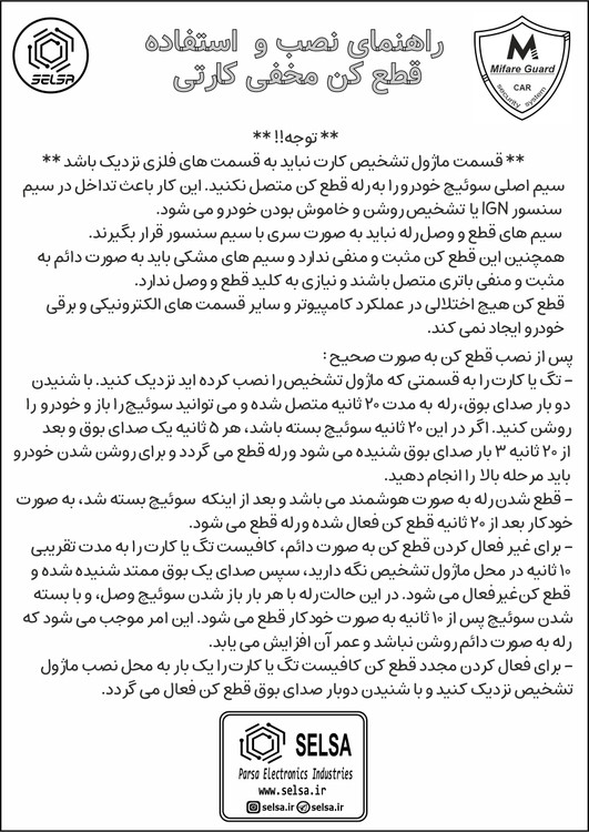 قطع کن کارتی یک سیستم حفاظتی خودرو مبتنی بر تکنولوژی مایفر تگ می باشد. پس از نصب آن، روشن کردن خودرو تنها به وسیله کارت و یا تَگ مخصوص امکان پذیر خواهد بود و در غیر این صورت خودرو روشن نخواهد شد. کارت و تگ برای هر خودرو منحصر به فرد و غیرقابل کپی و هک می باشد. نصب و استفاده از این سیستم بسیار راحت و کم هزینه است و همچنین راهنمای نصب و توضیحات کامل همراه محصول ارائه می شود. این سیستم امنیت و ایمنی بسیار بالایی دارد و طراحی آن به صورتی است که نقایص سایر محصولات حفاظت خودرو را پوشش دهد. ابعاد کوچک آن آزادی عمل زیادی در نصب آن ایجاد می کند. همچنین رله این سیستم قابل تعویض می باشد.